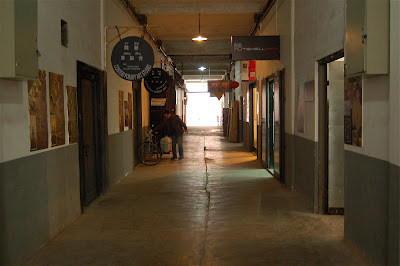 La foto in alto è scattata nel corridoio di uno dei primi stabilimenti. A destra e a sinistra i vari ingressi aprono sulle gallerie-atelier degli artisti.